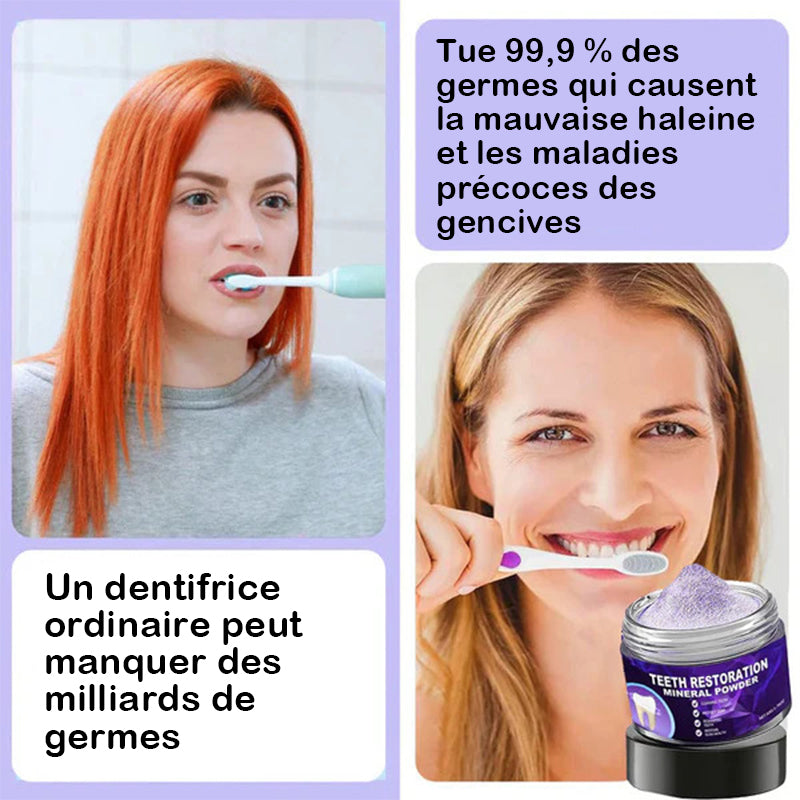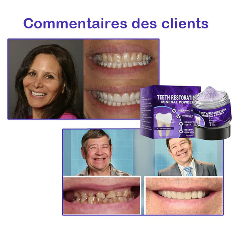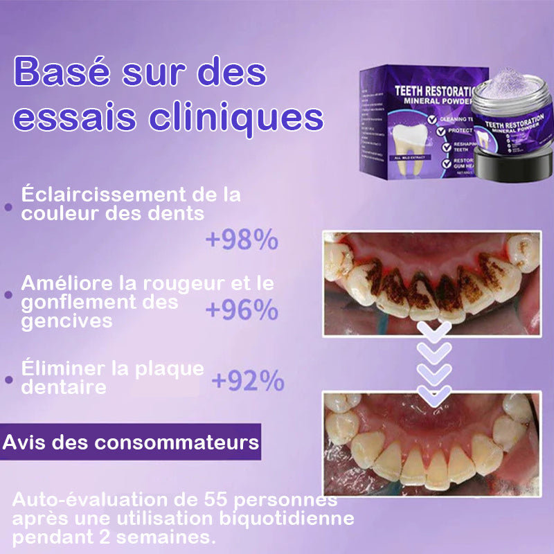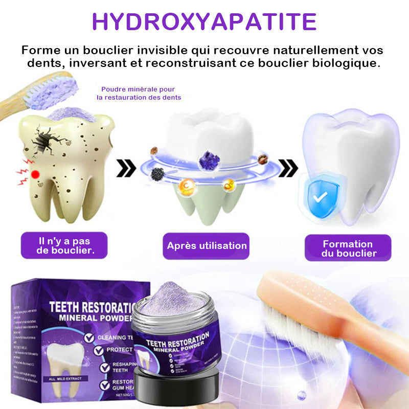 {"id":8846491943075,"title":"Poudre minérale pour restauration dentaire","handle":"poudre-minerale-pour-restauration-dentaire","description":"\u003cp\u003e\u003cspan style=\"color: rgb(255, 128, 0);\"\u003e\u003cstrong\u003eSoins dentaires ultimes : des solutions pour un sourire plus éclatant\u003c\/strong\u003e\u003c\/span\u003e\u003c\/p\u003e\n\u003cp\u003eDécouvrez la puissance de la poudre minérale de restauration dentaire\u003cbr\u003eRéparez, restaurez et protégez vos dents grâce à une science cliniquement prouvée\u003c\/p\u003e\n\u003cp\u003e\u003cimg style=\"display: block; margin-left: auto; margin-right: auto;\" alt=\"\" src=\"https:\/\/cdn.shopify.com\/s\/files\/1\/0548\/8377\/8692\/files\/2_4065e148-c731-4d32-83ec-90771a3e152d.jpg?v=1752828179\"\u003e\u003c\/p\u003e\n\u003cp\u003e\u003cspan style=\"color: rgb(255, 128, 0);\"\u003e\u003cstrong\u003ePourquoi choisir la poudre minérale de restauration dentaire ?\u003c\/strong\u003e\u003c\/span\u003e\u003c\/p\u003e\n\u003cp\u003e\u003cimg style=\"display: block; margin-left: auto; margin-right: auto;\" alt=\"\" src=\"https:\/\/cdn.shopify.com\/s\/files\/1\/0548\/8377\/8692\/files\/3_12530da8-86a3-4684-bb71-4deab2f9ccd6.jpg?v=1752828179\"\u003e\u003c\/p\u003e\n\u003cp\u003eÉlimine 99,99 % des bactéries nocives, combat la mauvaise haleine, élimine la plaque et le tartre, traite la gingivite et la parodontite, soulage les maux de dents, prévient et répare les caries, restaure l'émail, stimule la régénération de la dentine et favorise la réparation naturelle des dents - le tout dans une formule minérale puissante.\u003c\/p\u003e\n\u003cp\u003e\u003cspan style=\"color: rgb(255, 128, 0);\"\u003e\u003cstrong\u003eLa science derrière tout cela : révolutionner la régénération dentaire et la réparation des caries\u003c\/strong\u003e\u003c\/span\u003e\u003c\/p\u003e\n\u003cp\u003e\u003cstrong\u003eComprendre la carie dentaire et la déminéralisation de l'émail\u003c\/strong\u003e\u003cbr\u003eL'émail des dents est le tissu le plus dur du corps humain et est composé à 96 % de minéraux, principalement d'hydroxyapatite, un phosphate de calcium cristallin qui confère aux dents leur force et leur durabilité. Cependant, les bactéries et les acides présents dans les aliments peuvent entraîner une perte de minéraux dans l’émail des dents, ce qui entraîne une faiblesse structurelle et des caries dentaires.\u003c\/p\u003e\n\u003cp\u003e\u003cstrong\u003eComment il inverse les dégâts\u003c\/strong\u003e\u003cbr\u003eNotre Nano-Hydroxyapatite avancée imite l'émail minéral naturel, pénétrant les microfissures et reconstruisant l'émail à un niveau microscopique. Ce processus de reminéralisation restaure la dureté de l’émail des dents et stoppe la progression de la carie dentaire.\u003cbr\u003eIl fait plus que simplement réparer la surface : il stimule la formation de dentine, active les cellules régénératrices de la dent, reconstruit la structure sous-jacente, favorise une véritable régénération dentaire et maintient la santé bucco-dentaire à long terme.\u003c\/p\u003e\n\u003cp\u003e\u003cimg style=\"display: block; margin-left: auto; margin-right: auto;\" alt=\"\" src=\"https:\/\/cdn.shopify.com\/s\/files\/1\/0559\/7193\/8483\/files\/5_02084331-9250-4a75-b2ae-79e4eba84395.jpg?v=1752824947\"\u003e\u003c\/p\u003e\n\u003cp\u003e\u003cspan style=\"color: rgb(255, 128, 0);\"\u003e\u003cstrong\u003eAvantages complets en matière de soins bucco-dentaires\u003c\/strong\u003e\u003c\/span\u003e\u003c\/p\u003e\n\u003cp\u003e\u003cimg style=\"display: block; margin-left: auto; margin-right: auto;\" height=\"279\" width=\"481\" alt=\"\" src=\"https:\/\/cdn.shopify.com\/s\/files\/1\/0559\/7193\/8483\/files\/1_f7af0e81-1d5c-4f65-b265-f051dd3e4f20.webp?v=1752824949\"\u003e\u003c\/p\u003e\n\u003cul\u003e\n\u003cli\u003e\n\u003cspan style=\"color: rgb(255, 128, 0);\"\u003e\u003cstrong\u003eSOULAGEMENT RAPIDE DE LA DOULEUR ET DE L'INFLAMMATION :\u003c\/strong\u003e\u003c\/span\u003e Les anesthésiques naturels et le charbon actif réduisent le gonflement, la sensibilité et l'inconfort des gencives pour un soulagement apaisant instantané.\u003cbr\u003e\n\u003c\/li\u003e\n\u003cli\u003e\n\u003cspan style=\"color: rgb(255, 128, 0);\"\u003e\u003cstrong\u003eRégénération dentaire :\u003c\/strong\u003e\u003c\/span\u003e stimule la croissance de la dentine et la reminéralisation de l’émail, répare les caries précoces et renforce votre sourire de l’intérieur vers l’extérieur.\u003c\/li\u003e\n\u003c\/ul\u003e\n\u003cp\u003e\u003cimg style=\"display: block; margin-left: auto; margin-right: auto;\" alt=\"\" src=\"https:\/\/cdn.shopify.com\/s\/files\/1\/0548\/8377\/8692\/files\/6_fbca371d-781f-4faa-bc88-df3ae2113e42.jpg?v=1752828179\"\u003e\u003c\/p\u003e\n\u003cul\u003e\n\u003cli\u003e\n\u003cspan style=\"color: rgb(255, 128, 0);\"\u003e\u003cstrong\u003eÉlimination puissante de la plaque et du tartre : \u003c\/strong\u003e\u003c\/span\u003ele Triphala et les extraits de plantes décomposent la plaque et le tartre tenaces pour restaurer des dents brillantes et saines.\u003cbr\u003e\n\u003c\/li\u003e\n\u003cli\u003e\n\u003cspan style=\"color: rgb(255, 128, 0);\"\u003e\u003cstrong\u003ePrévient et répare la carie dentaire : \u003c\/strong\u003e\u003c\/span\u003eles éléments minéraux tuent les bactéries nocives, empêchent la formation de caries et favorisent la cicatrisation de l'émail des dents.\u003c\/li\u003e\n\u003c\/ul\u003e\n\u003cp\u003e\u003cimg style=\"display: block; margin-left: auto; margin-right: auto;\" alt=\"\" src=\"https:\/\/cdn.shopify.com\/s\/files\/1\/0548\/8377\/8692\/files\/7_f1657a82-d283-4e10-af14-f47dafed0cf3.jpg?v=1752828179\"\u003e\u003c\/p\u003e\n\u003cul\u003e\n\u003cli\u003e\n\u003cspan style=\"color: rgb(255, 128, 0);\"\u003e\u003cstrong\u003eBlanchiment des dents :\u003c\/strong\u003e\u003c\/span\u003e Le colorant violet neutralise la teinte jaune ; La vitamine 
